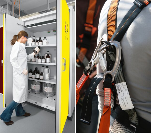 Unsere Schwerpunkte liegen auf der sicheren Aufbewahrung von brennbaren Flüssigkeiten und Batterien/Akkus sowie auf Persönlichen Schutzausrüstungen gegen Absturz (PSAgA).