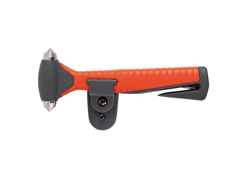 Der Lifehammer Plus mit beidseitigem Hammerkopf aus Carbonstahl zertrümmert mühelos die Seitenscheibe jedes Fahrzeugs. Das integrierte Gurtmesser zerschneidet Sicherheitsgurte mühelos.