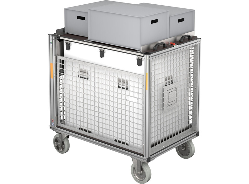 - Lieferung ohne abgebildeten Aufsetzdeckel mit drei Euroboxen 600 x 400 mm zur Aufnahme von Zubehör (optional)