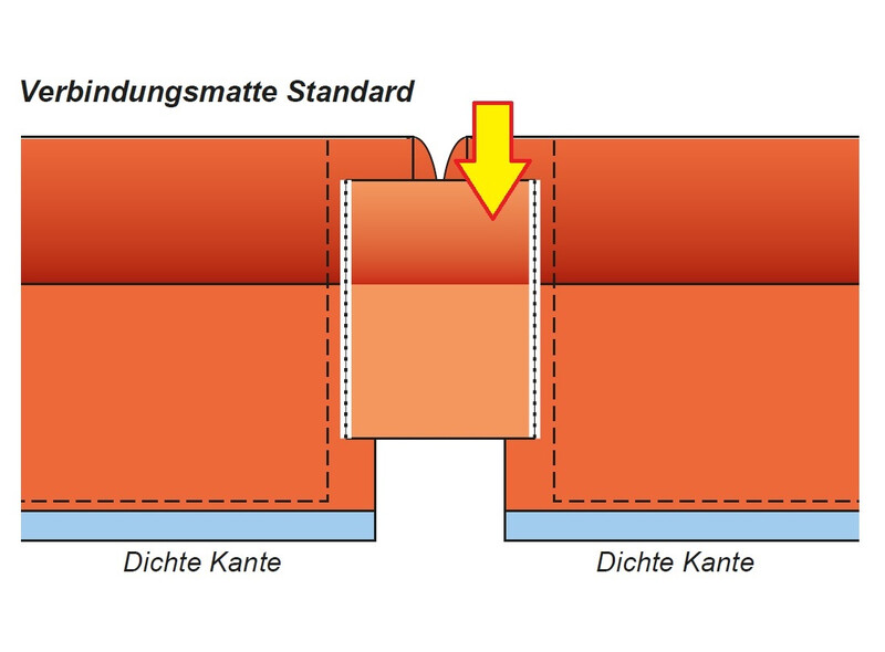 Eine Verbindungsmatte muss vom Reißverschluss der einen Schürze bis zum Reißverschluss der anderen Schürze reichen, wobei das Material nicht zu sehr gedehnt werden darf. Ist dies nicht möglich, ist eine weitere Verbindungsmatte zu verwenden.